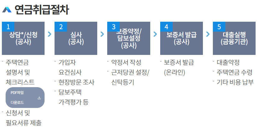 상담/신청 ▶ 심사 ▶ 보증약정/담보설정 ▶ 보증서 발급 ▶ 대출실행 순으로 진행됩니다.