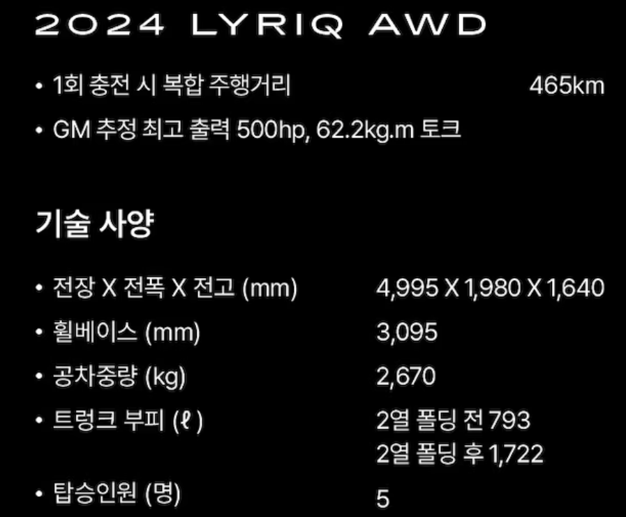 리릭의 주행거리는 1회 충전 시 무려 465km입니다. 그리고 지금까지 들어오지 못했던 어댑티브 크루즈 컨트롤까지 들어왔는데요. 캐딜락을 좋아하셨던 분들이 가장 아쉬워했던 게 주행보조장치의 부재였는데 잘 해결이 된 것 같습니다.